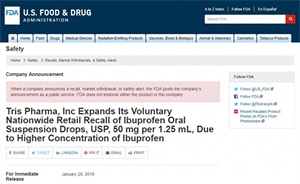 但从原文可以看出,其实是美国Tris制药公司的一款布洛芬口服混悬滴剂,由于部分批次可能含有较高浓度,超过规定标准10%的布洛芬,而做了全国范围的召回。