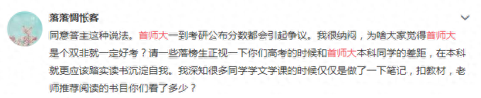 同时网上也有一些网友发出不同声音,认为北上广的高校本来就是旱区,报考的考生多,因此会适当压分以控制人数,况且压分又不是针对一个人,大家都压分了,这相对来说,还是公平的。“同样的判卷标准,那别人怎么就能考高分?”甚至有人质疑,网上这么多骂首师的,可能也存在一些是在为自己考研失败找借口,让自己好受点。