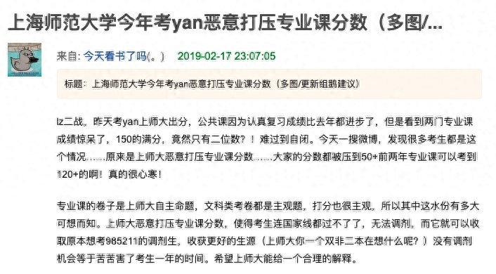 他还透露,2016年考研,上师大也发生过类似的事情,自主命题的专业课大量出现三十、四十多的低分,导致最终招到的学生多为调剂生。原帖爆料者则表示,自己会去学校查分并将结果更新在帖子中,截至发稿前,爆料者未更新查分情况。