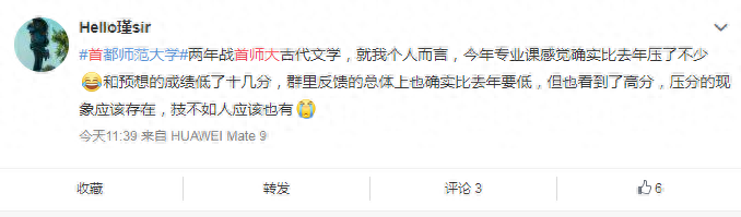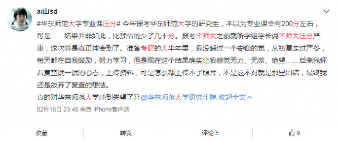 微博上也有多位网友发帖称,华师大考研专业课压分,一网友称自己专业课比预估的少了几十分,且这位网友表示,“报考华师大之前就听学姐学长说华师大压分严重,这次算是真正体会到了”。