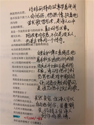 第二页从“阿波里内尔君”到“吐出堇色的故事”,我批的是:玛格里特的故事带着浅浅的忧伤,她热情、执着地追求歌唱艺术,是诗人心中真正的艺术家。后面紧接着批的是:阿里波内尔,不仅是波兰人,也是这样的一个传奇。这里我之所以批得颠倒,是我觉得先要弄清楚诗人所说的“流传在蒙马特的故事”是怎样的一个故事,才能懂诗人为什么说阿波里内尔在诗人的眼里是这样的一个故事。