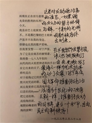 诗的最后一部分我起作了批注,如下:艺术被禁锢,诗人也被限制了自由,更激发了像诗人一样为艺术抗争的人们会像1789年法国大革命推翻统治法国多个世纪的波旁王朝一样,推翻反动的世界,建立一个和平、自由、民主的新秩序!