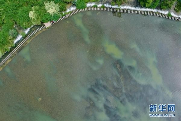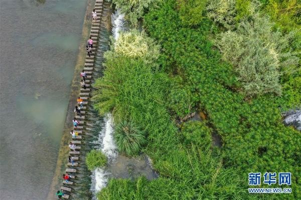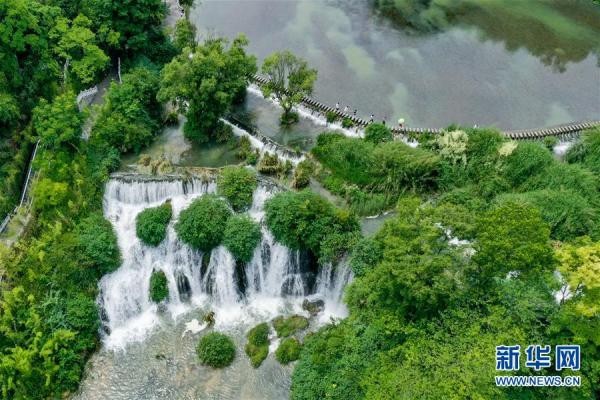 6月9日,游人在贵阳市天河潭旅游度假区游玩(无人机照片)。 夏日的贵阳市天河潭旅游度假区草木苍翠,风景如画,吸引游客来此休闲游玩。 新华社记者 欧东衢 摄