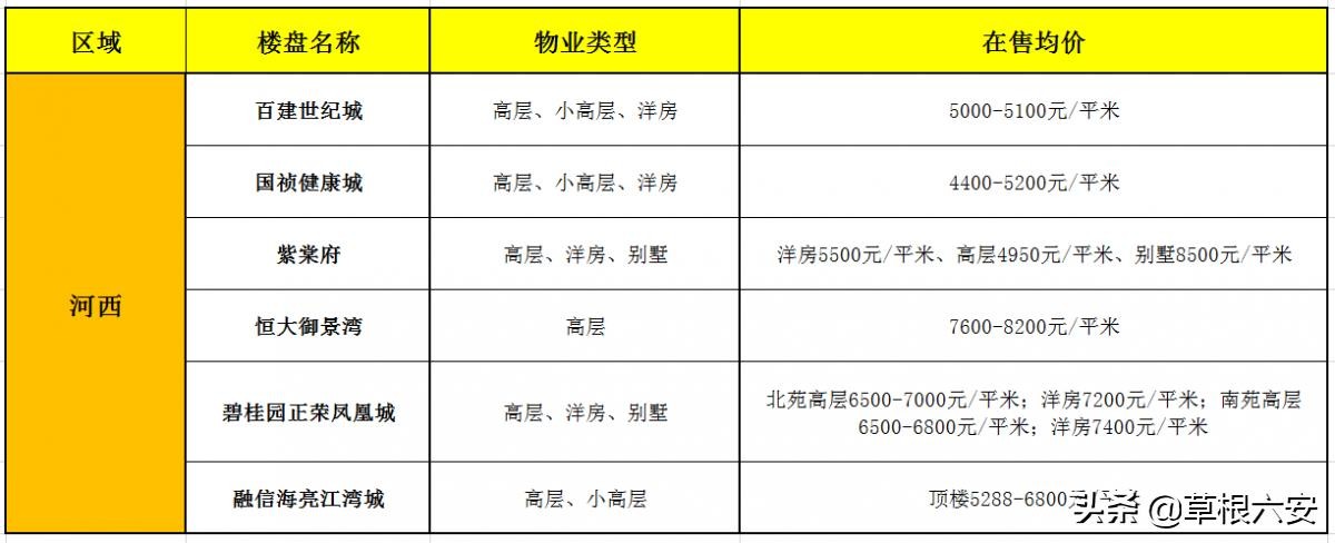 河西分为新安大桥方向和平桥方向,区域跨度很大。平桥方向价格很刚需,均价5000元/㎡左右,新安大桥方向均价7500元/㎡左右。河西板块正在以惊人的速度飞快崛起,六安市体育中心、广播电视塔一旦建成,板块发展将会迎来新一轮契机!