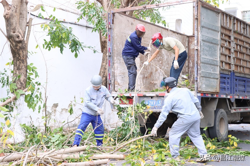 记者在石碌镇海虹路2号居民楼门前看到,有不少树枝掉落在铁皮屋顶上,县园林绿化站工作人员正手持专业工具,对茂盛的树枝进行修剪,并将修剪下的树枝及时拖运和清理,确保群众出行安全。