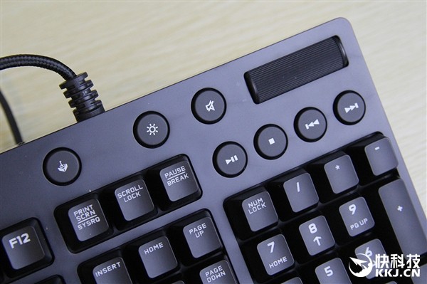 此外,其支持白色背光,右上角还有多媒体键区、游戏模式锁止键,包括罗技独创的音量滚动条。