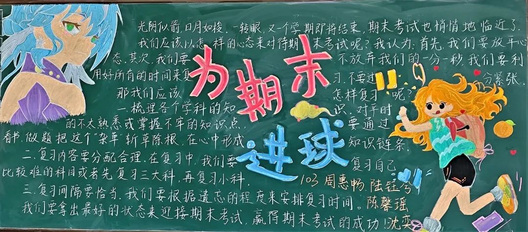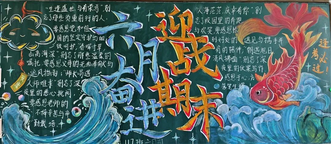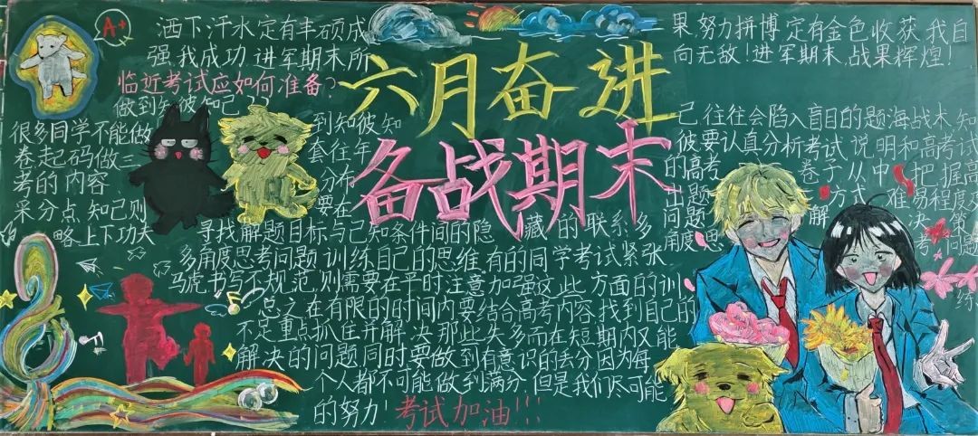 为了激发同学们的创造力,营造备战期末考试的氛围,树立考试必胜的决心。6月3日德清县求是高级中学高一年级开展了以“全力以赴,冲刺期末”为主题的黑板报评比活动。各班的板报“设计师”们纷纷发挥特长,团结互助完成了本次的板报创作。