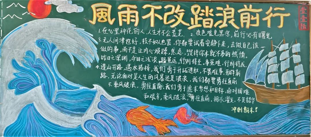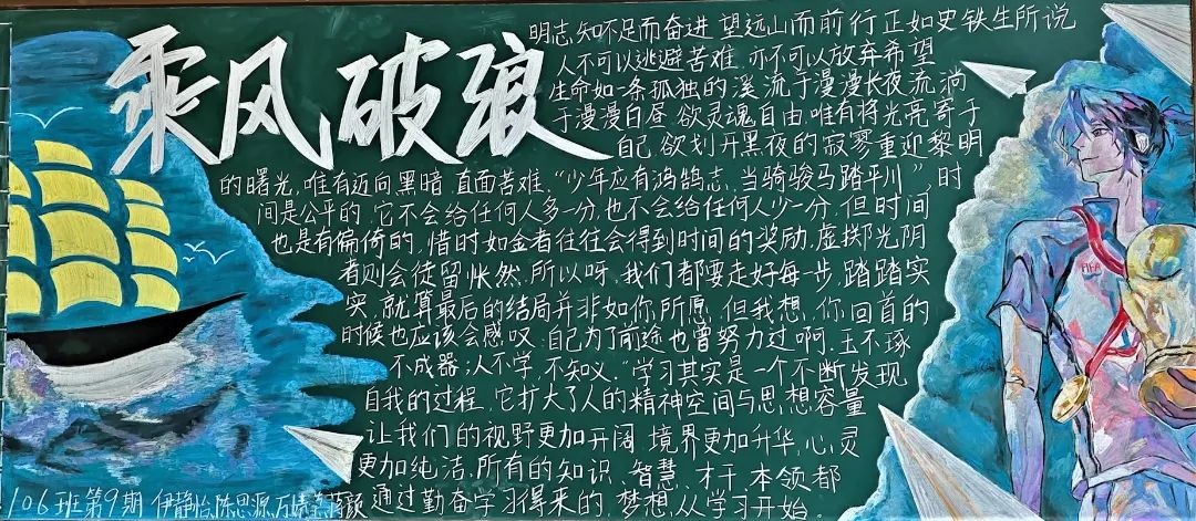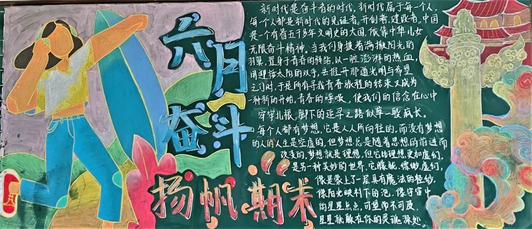 一面面板报,绘制于三尺黑板之上,相信在积极向上的校园文化氛围的浸润下,同学们将以最饱满的热情迎接新的挑战,夺取新的胜利。让我们翻过时光的高山,启程再出发,提笔写未来;让我们踏上成功的阶梯,展露新姿态,奔向新高度!
