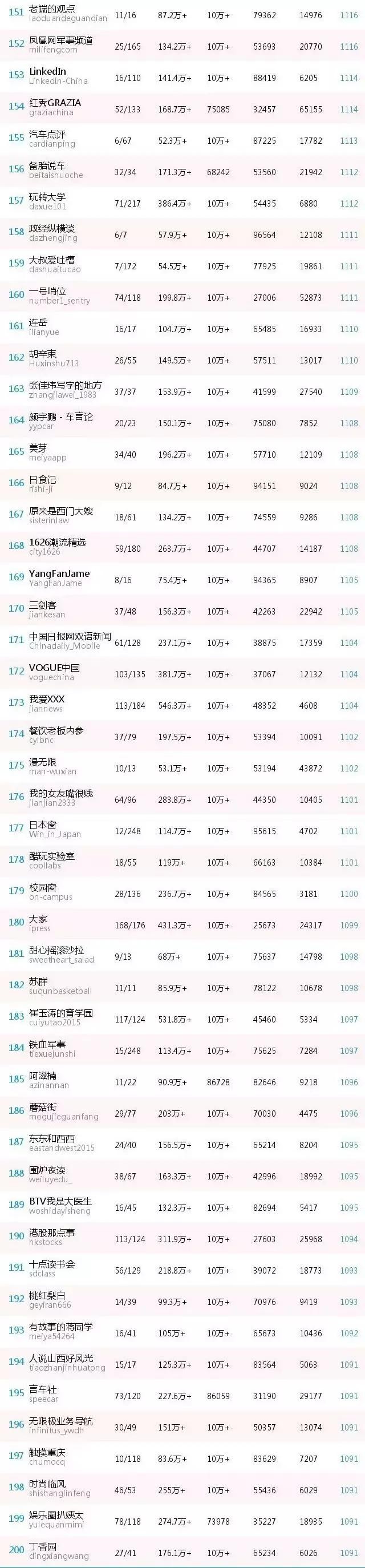 TOP200中有不少账号突出重围,尤以“周冲的影像声色”别具一格,将文艺定位作为精准切入点,文章内容或关乎情感、教育,或猝不及防地来个软广,也会另辟蹊径抓热点,文字犀利,理性幽默,在众多八卦、鸡汤内容泛滥的公号中独树一帜。本期表现可圈可点,51篇推文,阅读总量408.9万+,点赞量10万+,以1277的WCI值从34名飙升至第13名。(点击图片可查看清晰原图)