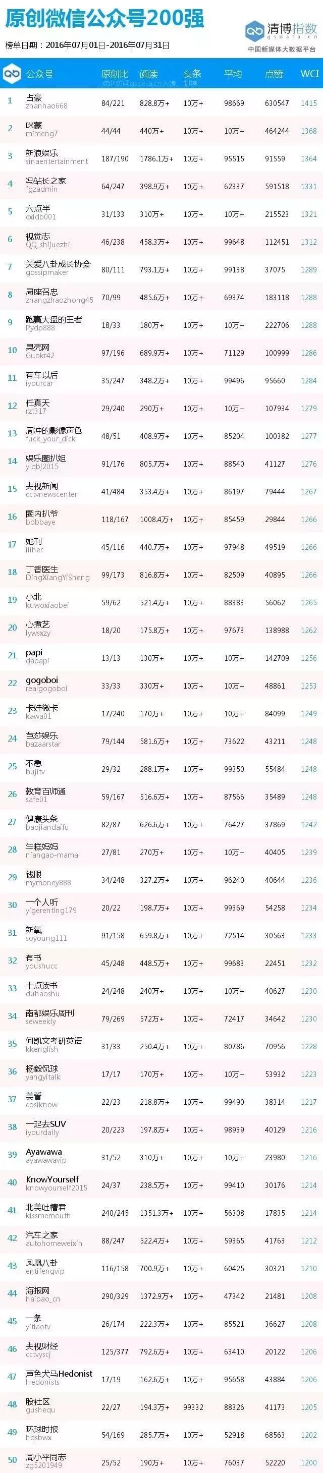 7月原创公号TOP200,除了“占豪”、“咪蒙”两位公号排名保持不变,“后居者”们上演了一番龙争虎斗。“新浪娱乐”以本榜1786.1万+的最高阅读总量成功跻身第三,随即“六点半”、“视觉志”、“果壳网”等公号就势崛起,强势驻进前十,分别位列第五、第六、第十名。