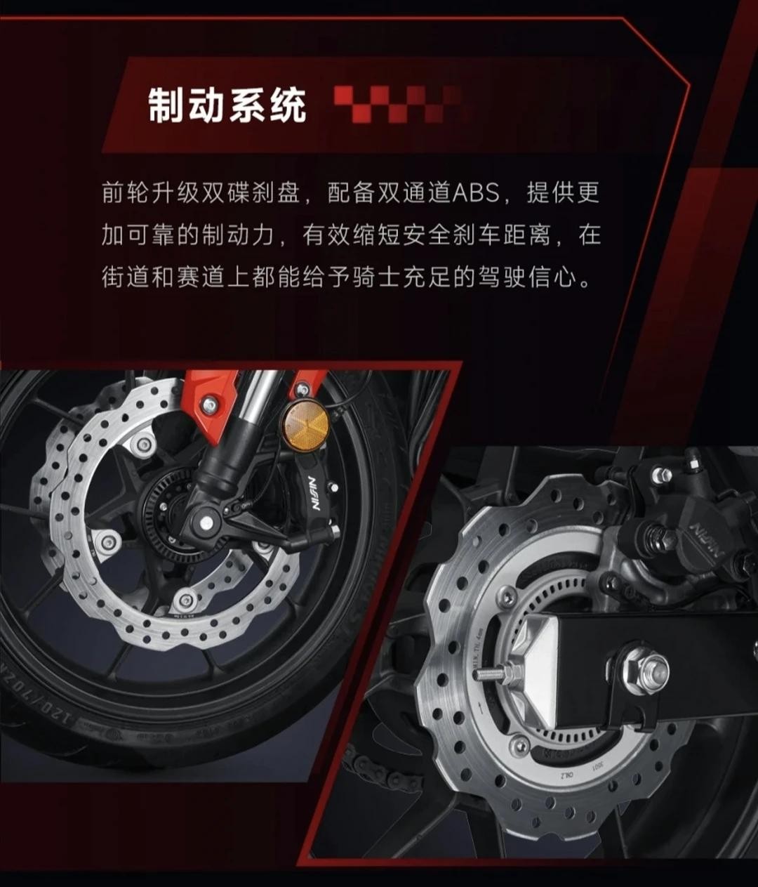 动力上,依然采用了实际排量399CC的Honda直接双缸水冷发动机,最大扭矩37.0/7500,最大净功率33.0/9000。加上前轮双碟刹盘和前后双通道ABS,提供了更可靠的制动力和更安全的刹车距离,再加上高品质子午线轮胎,为驾驶提供更强大的信心。