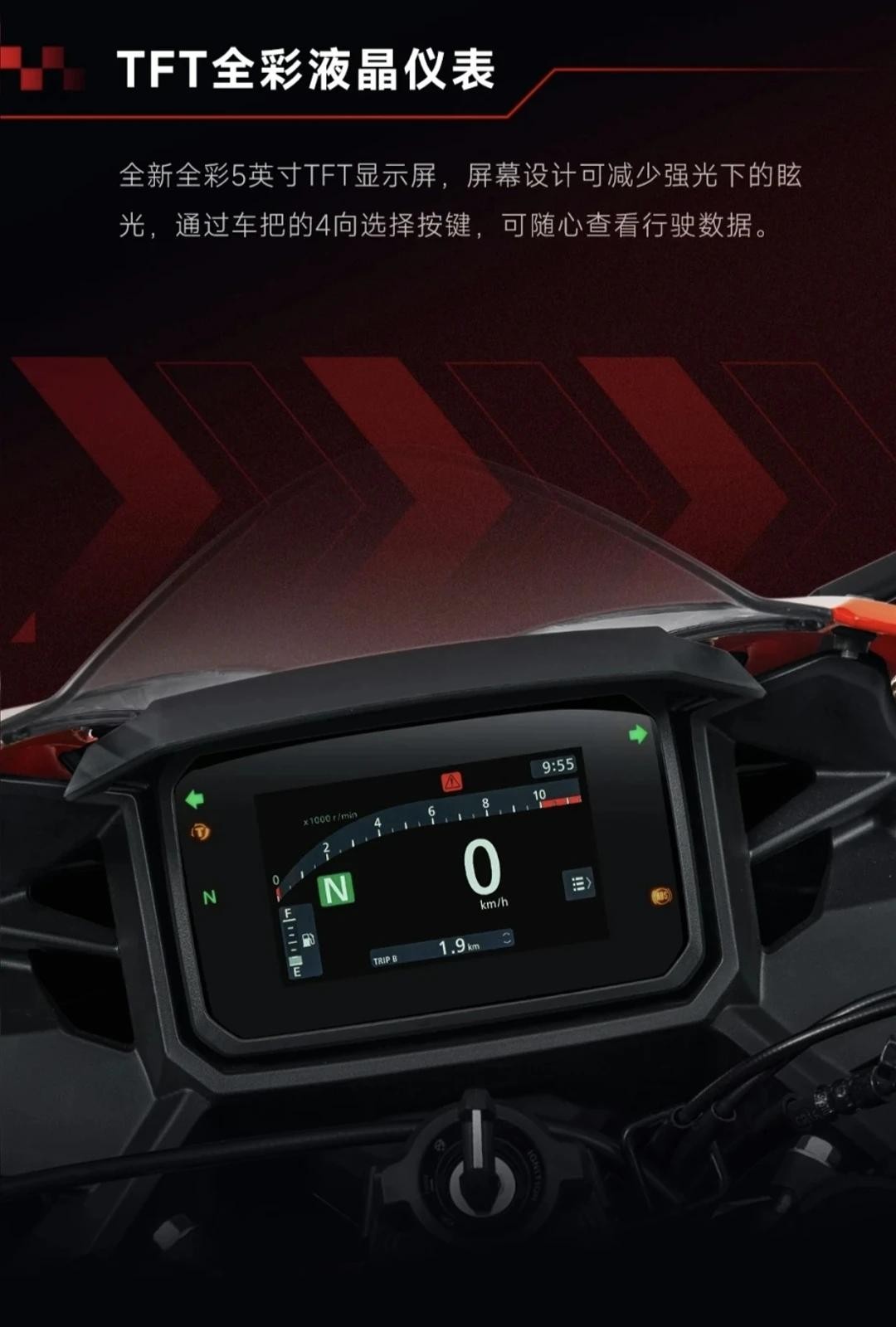 全新的TFT液晶仪表,可通过车把上的按键来察看行车数据。加上全新的LED前大灯和尾灯,科技感愈发强烈。车把上还集成了HONDA可调扭矩控制系统,方便了骑士的操作,在湿滑路面可有效抑制后轮打滑。