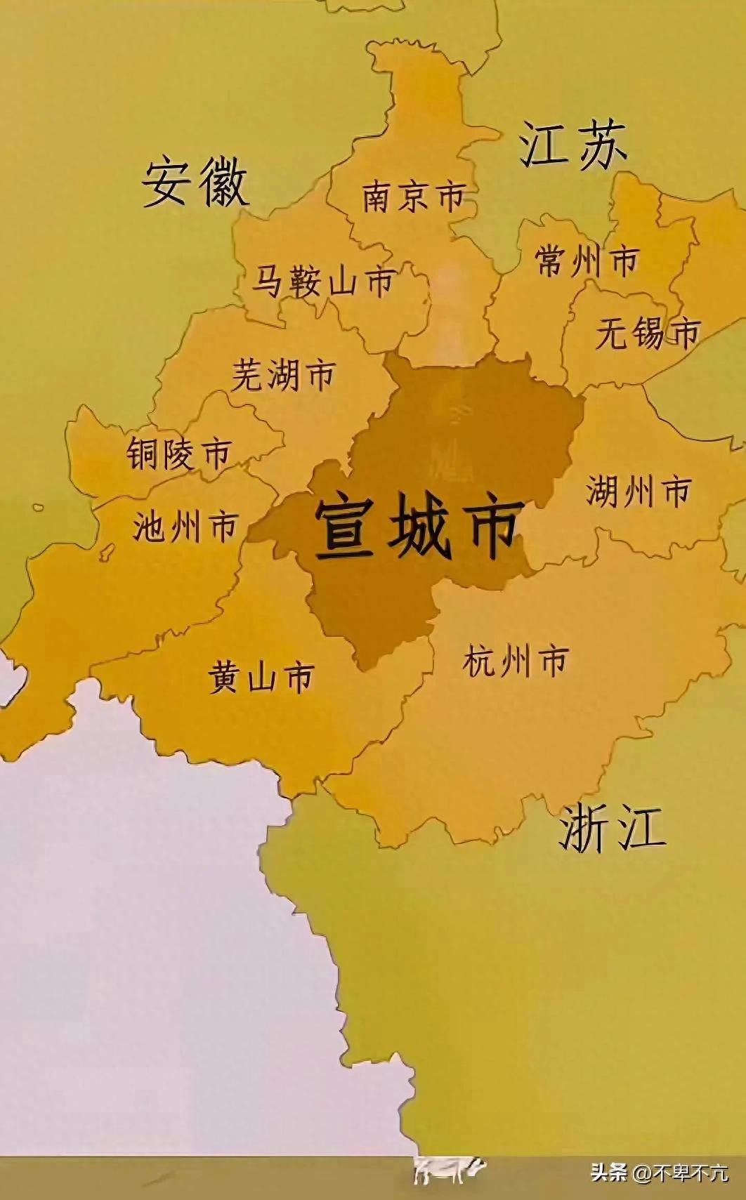 上面这幅图想要说的城市是安徽省的宣城市,单提这个城市,估计很多人一下子还不知道它属于哪个省。今天要跟大家说的是宣城跟9个地级市接壤,是邻居。宣城属于3省交界处,跟自己省的4个城市,黄山市、池州市、芜湖市、马鞍山市接壤;跟江苏省的3个城市,南京市、常州市、无锡市接壤;跟浙江省2个,湖州市和杭州市接壤。