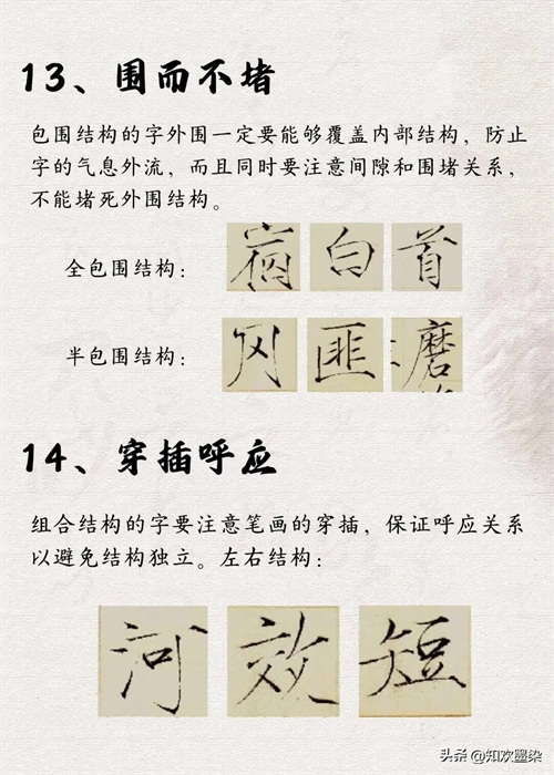 组合结构的字要注意笔画的穿插,保证呼应关系以避免结构独立。
