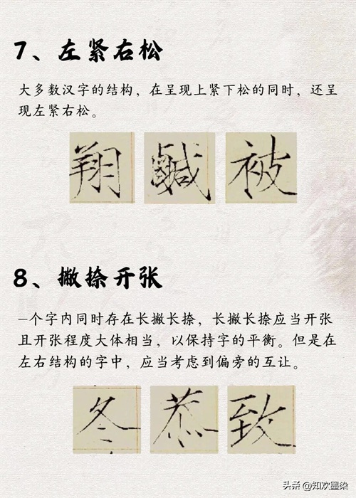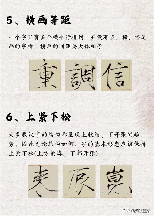 大多数汉字的结构都呈现上收缩、下开张的趋势,因此无论结构如何,字的基本形态应该保持上紧下松(上方紧凑、下部开张)。