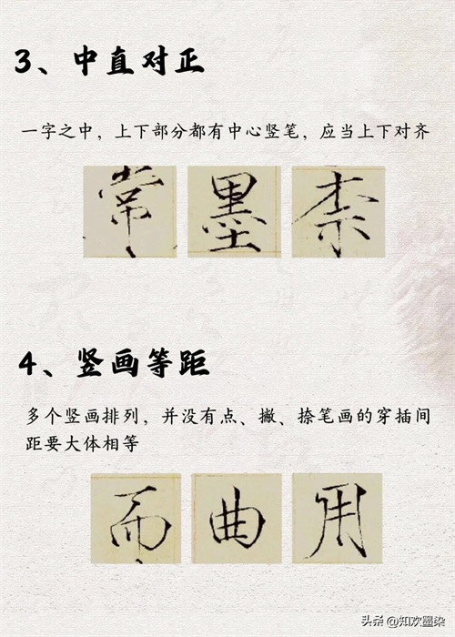 多个竖画排列,并没有点、撇、捺笔画的穿插间距要大体相等。
