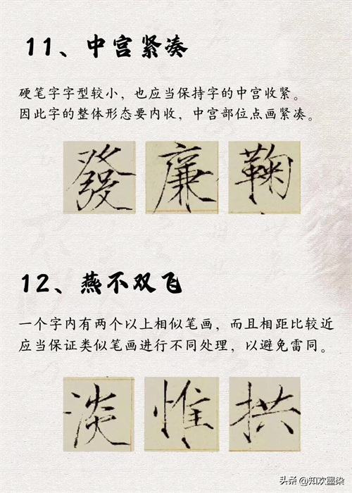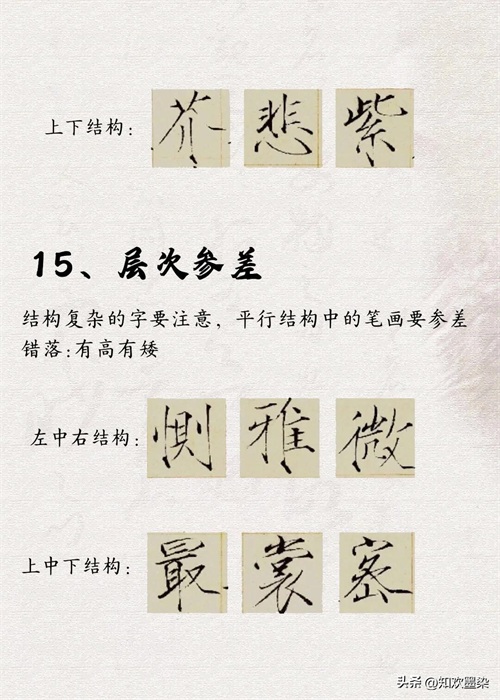 结构复杂的字要注意,平行结构中的笔画要参差错落:有高有矮