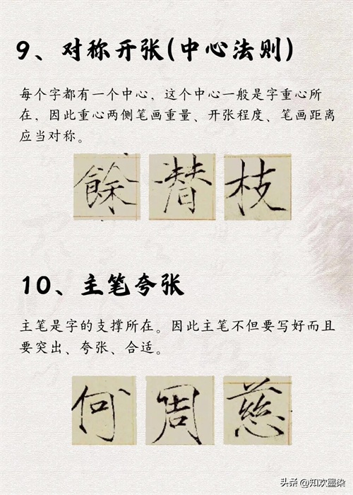 每个字都有一个中心,这个中心一般是字重心所在,因此重心两侧笔画重量、开张程度、笔画距离应当对称。