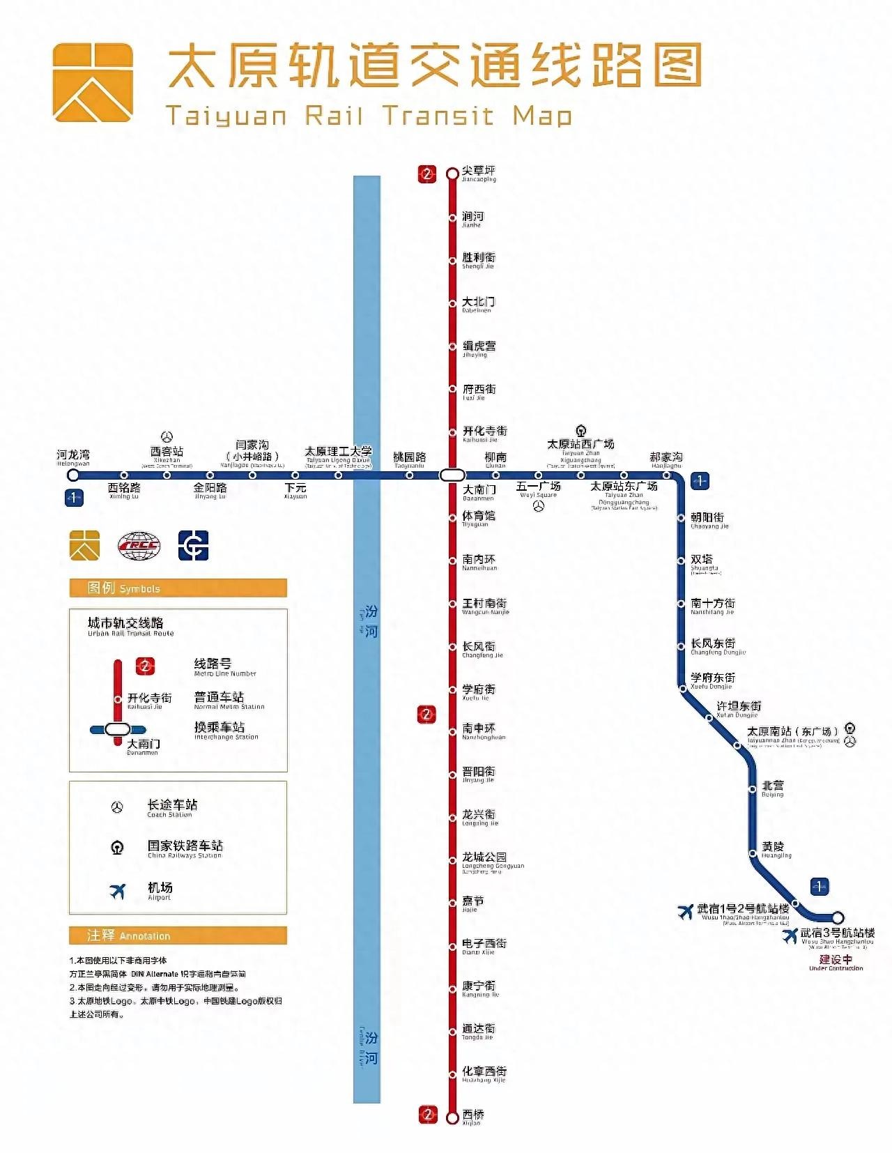 • 线路走向:西起万柏林区河龙湾站,经过下元站、迎泽区下穿汾河、太原站、太原南站、太原武宿国际机场等地,终至小店区武宿1号2号航站楼站,整体呈西北-东南走向。
