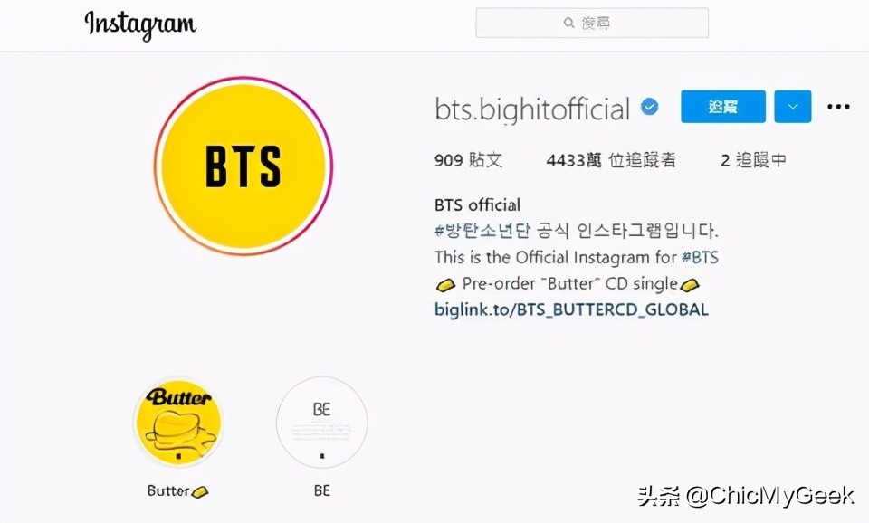 这是经纪公司HYBE经营的BTS官方Instagram,通常是用来展示成员们的作品、专辑或日常等等,好让粉丝可以轻松知道第一手消息,而且该帐号大多是由工作人员管理,尤其是BTS粉丝遍布全球,单是官方Instagram帐号就拥有超过4433万粉丝。所以里头出现的一举一动,都是全世界的焦点。