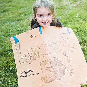 7岁的“柠檬水女孩”朱丽·墨菲拿着自己柠檬水小摊的广告牌。正在等候顾客的小朱丽。