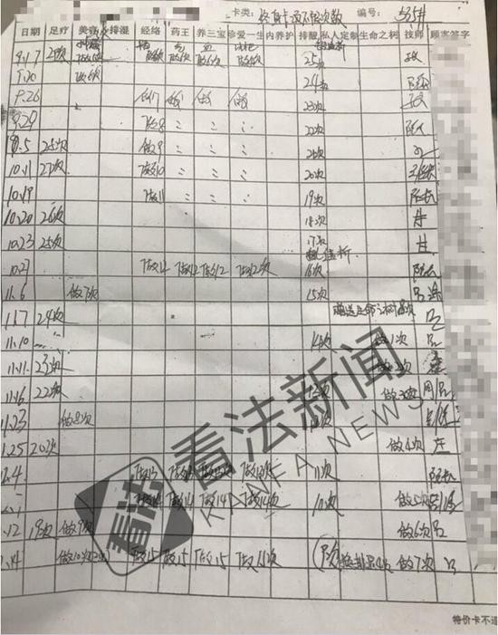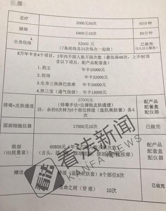 得知母亲的遭遇后,汪鸣来到该美容院,得到了一张表格,显示江阿姨在店里接受了多项服务,其中年卡8万、 “全身经络”3.2万、“眼部HA能量套”6万元、“皮肤通透、排毒”2.7万、“面部细胞仪”1.7万、“腿部”6800元、足疗2000元等。
