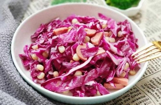 紫甘蓝富含丰富的维生素和花青素,能延缓皮肤衰老。紫甘蓝中的花青素稳定性较差,加热就很容易流失,所以紫甘蓝最好是做成沙拉直接食用。