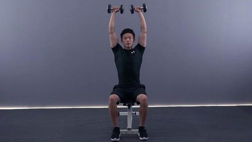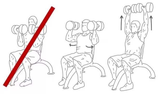 如果你熟悉坐姿哑铃推肩这个基础动作,那么想要掌握阿诺德推举就显得容易多了,毕竟它的动作模式,只是在肩上推举过程中,加入了一个肩部外旋的动作,我们以传统哑铃推肩为例进行说明。