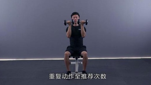 1.按照传统哑铃坐姿推肩的轨迹完成一个肩上推举,依旧下落至大臂平行于地面,此时掌心向前