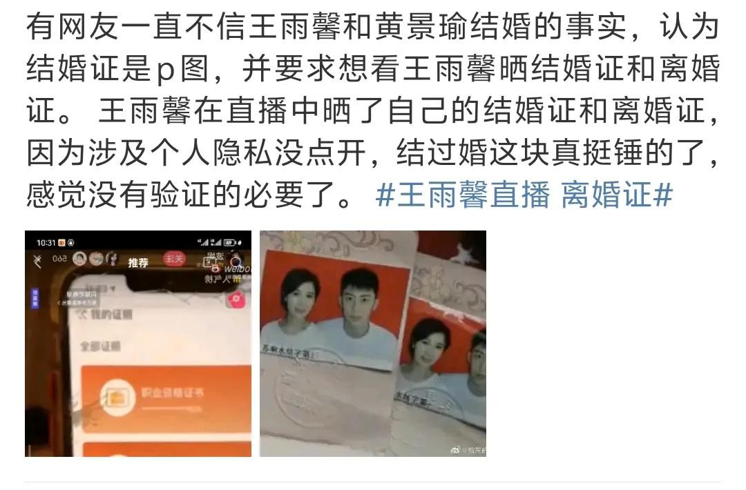 这事儿去年又翻出新剧情。王雨馨直播时掏出一叠证件,从结婚证到离婚证再到心理诊断书,连录音都搬出来了。吃瓜群众刚要沸腾,黄景瑜反手晒出法院判决书,白纸黑字写着“无家暴事实”,还附赠一句:“过去的就过去了,彼此安好吧。”本以为这事翻篇了,谁知今年王雨馨突然发文暗指有人“知三当三”,评论区直接点名张艺上。