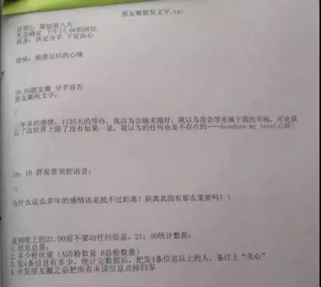 案发后,警方整理该团伙的诈骗剧本超过100多页,涵盖了30天里每一天诈骗内容的设定,包括几点钟发朋友圈,几点钟群发私信等。诈骗剧本堪比电影分镜头。