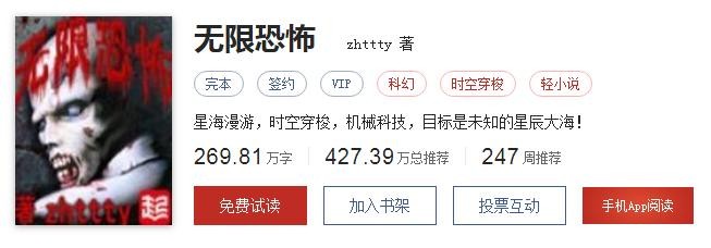 故事情节我就不介绍了,基本上看网络小说的都看过了。《无限恐怖》是zhttty所作的著名网络小说,无限系列的第一部,首发于起点中文网。开创了国内网络原创文学“无限流”的第一本作品。确立了后世无限流小说的主要样式:由现世所未知的科技创造的独特空间;把现世之人召唤过去并且将人送往类似电影的平行宇宙进行历练;获得各种奖励由此可促进人体进化等,作者不走老套的玄幻的小说路线,而是采用了用电影来铺设情节,使情节更加的充满变数。