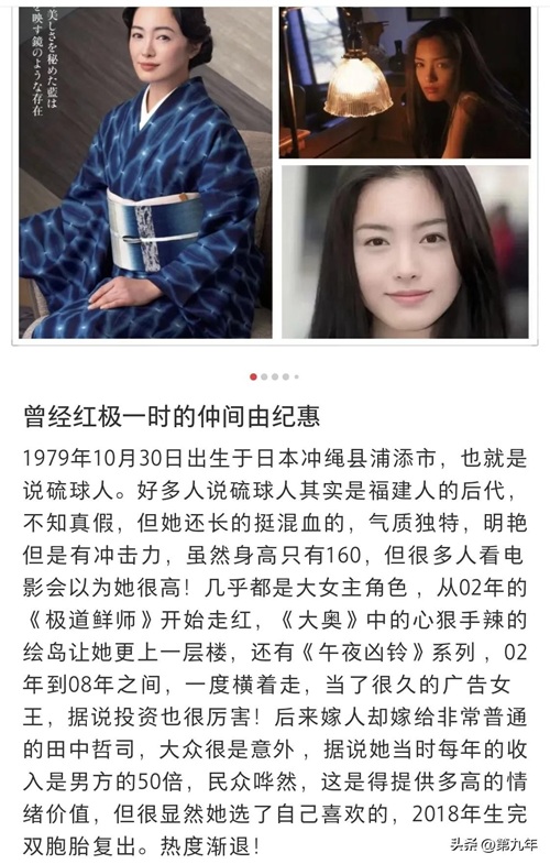 她虽然法律来说是日本人,但是据了解她是冲绳人,也就是以前的琉球。你还别说她还真的有点国人的气质。这样的美女最后也是嫁个普通人,是不是美女最后都会选择一个平凡的人。