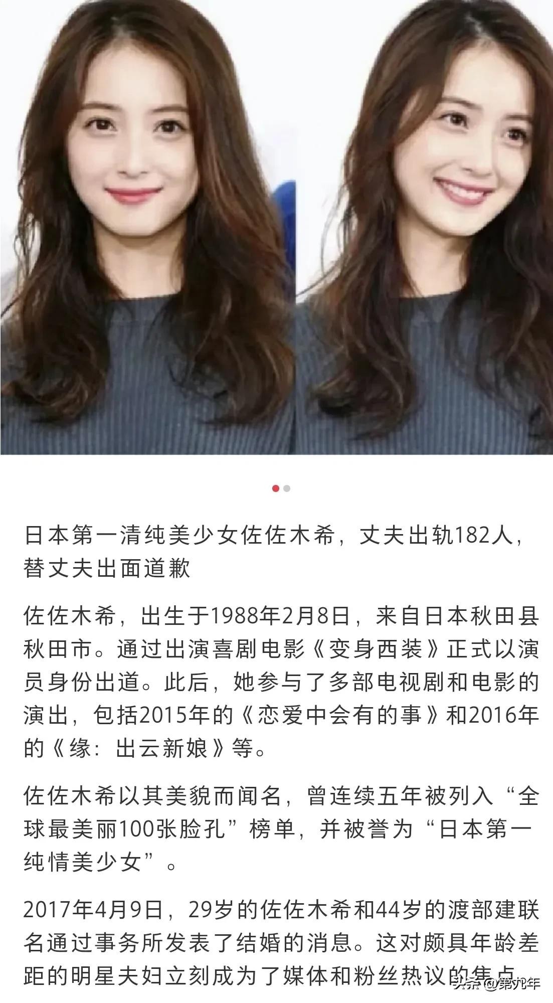 按道理像佐佐木希这样的女神应该是很多男人心中想要另一半的类型。奈何美女终究喜欢丑男,根据媒体了解佐佐木希的丈夫一位日本的搞笑艺人。颜值几乎没有,然后更炸裂的是,佐佐木希的丈夫婚内出轨182人,关键最后还是佐佐木希出面替老公道歉。这波操作我真的是看不懂。后来更有消息称佐佐木希被老公家暴,最后还是选择原谅,这位日本第一清纯美女也是有悲剧色彩。