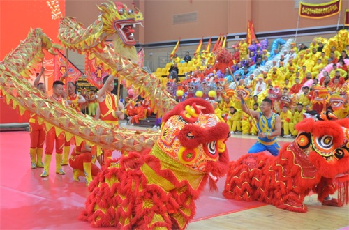 伴随着振奋人心的锣鼓声和现场观众热烈的喝彩声,造型各异、色彩丰富的“巨龙”在耍龙人的手中翻着花活,时而空中翻腾,时而地面游走,时而盘旋成圈,以高超的技巧和精湛的演绎展示着舞龙文化的魅力和奋发向上的精神。数只醒狮形神兼备、动作刚劲,灵巧地在搭好的梅花桩上穿梭腾跃,一张一弛、一盼一探,惟妙惟肖地展现了南派雄狮的风采。