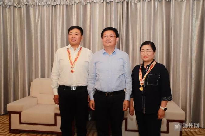 滨州市委书记、市人大常委会主任佘春明(中)为魏桥创业集团董事长张波,魏桥创业集团党委书记、总经理张红霞颁发“庆祝中华人民共和国成立70周年”纪念章。