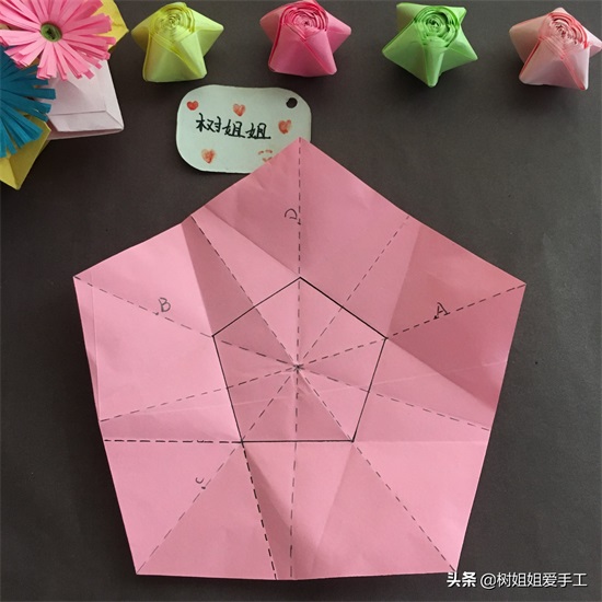 3、五条变成折完后,折痕线上形成了5个点,中间形成了一个缩小的五边形,每个角2边可以清晰看到平行四边的折痕区域。