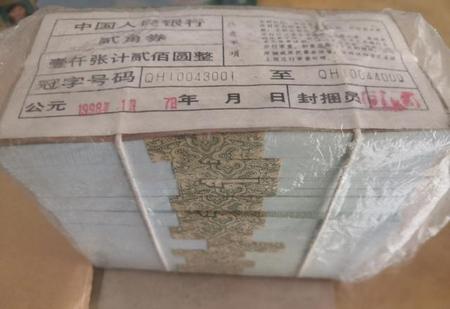 从题主图中看出,1000张80版2毛,即一捆8002。保管完好,封签显示冠字为QH,号码为10043001-10044000,出厂时间为98年1月7日,线装花腰带。