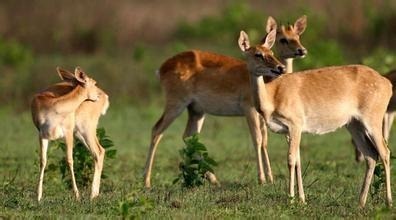 5、坡鹿:是泽鹿的亚种,这是一种濒临灭绝的鹿种,十分珍贵。它原分布于泰国、越南、缅甸、印度和中国南部边缘地区,现仅在中国海南省东方县大田乡境内尚有少量生存,为中国一类保护动物。外形与梅花鹿相似,但体形较小,花斑较少。毛被黄棕、红棕或棕褐色,背中线黑褐色。背脊两侧各有一列白色斑点。