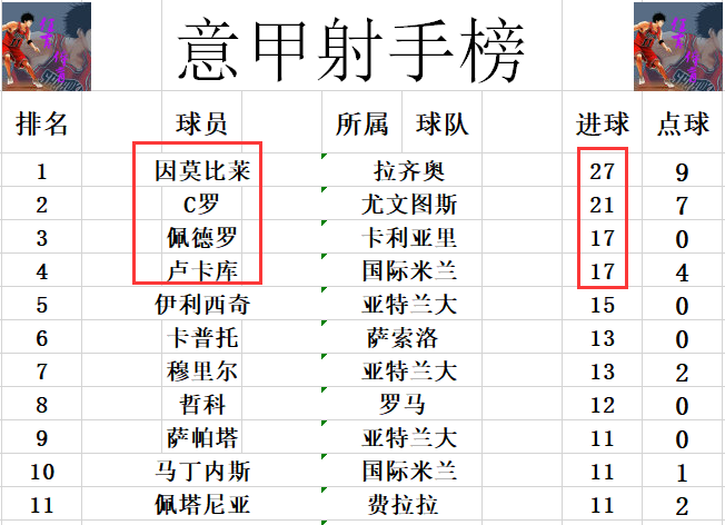 射手榜方面,前十没有变化,因莫比莱27球位列榜首,C罗21球排在第2,卢卡库则是17球排在第3。
