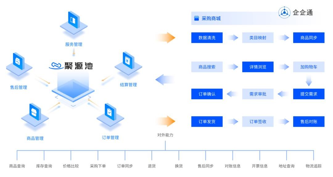 企企通聚源池,具备丰富的货源,满足采购商的“一站式”采购需求。其拥有强大功能模块,通过其对外能力赋能给采购商城,并通过打通商城与采购商内部系统接口,实现资源互联、业财互通。