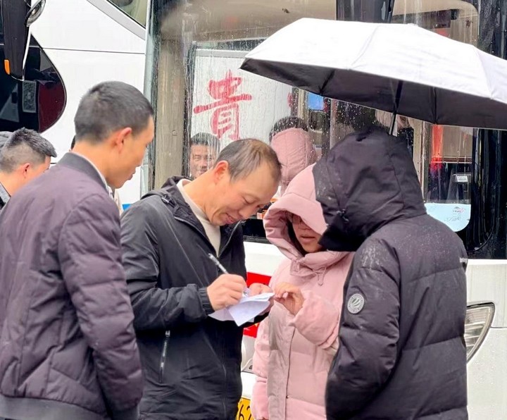 活动现场,工作人员确认务工群众乘车名单。习水县融媒体中心供图