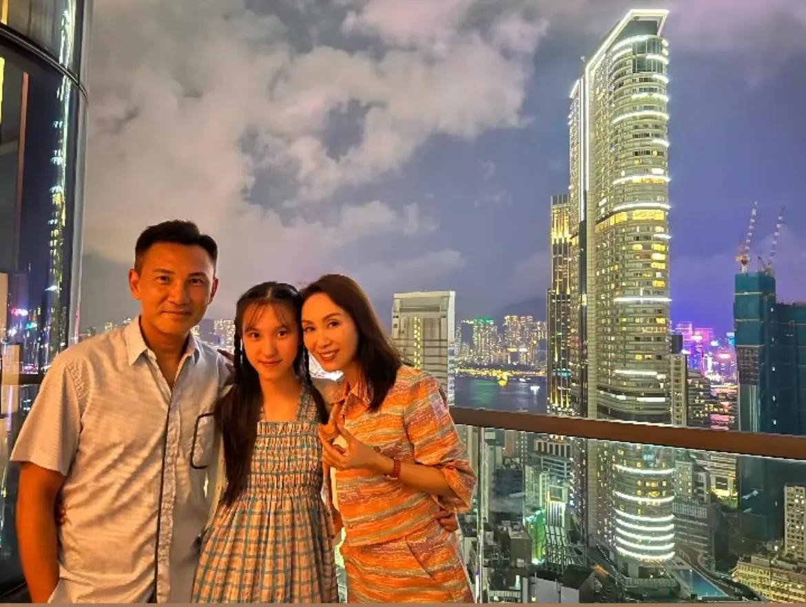 郭可盈晒中秋全家福,一家三口相拥赏月温馨有爱,13岁爱女很漂亮