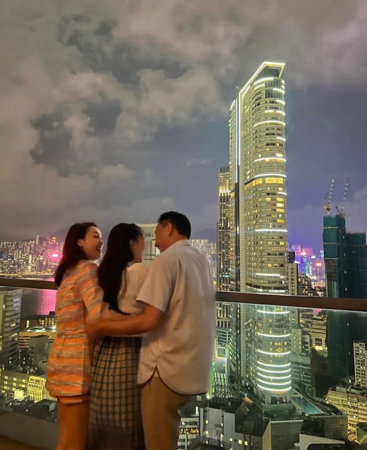 一家三口站在阳台上看夜景赏月,郭可盈搂着女儿腰,一脸笑容回头看向镜头,林文龙搭着老婆肩膀,三人热聊不停,脸上都洋溢着笑容,看起来好欢乐,家庭氛围真的好幸福呀。