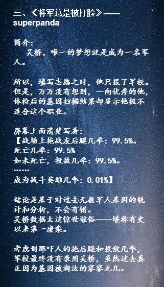 排雷:作者的故事设定很有意思,古代大侠穿越到未来星际,但是作者在人物的把控和故事的塑造上不算特别成熟,很多情节会给人一种刻意的尴尬感,但整体来说不失为一篇设定新奇的小说,喜欢爽文的读者可以试读一下。