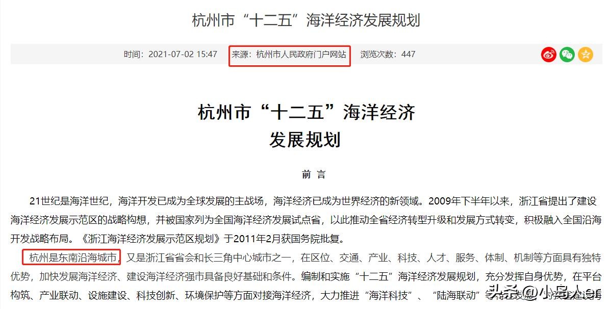 根据杭州市人民政府网站公布的相关会议以及杭州市人民政府发布的关于《杭州市“十二五”海洋经济发展规划》中,均明确杭州市是沿海城市,同时明确提出“杭州没有海域,深海岸线资源缺乏,仅在萧围东线二十工段至萧绍分界线间的围垦区岸线长约11公里,与外海直接相连”。通俗来讲就是,杭州是一个没有海域的特殊沿海城市,算是官方的盖棺定论。