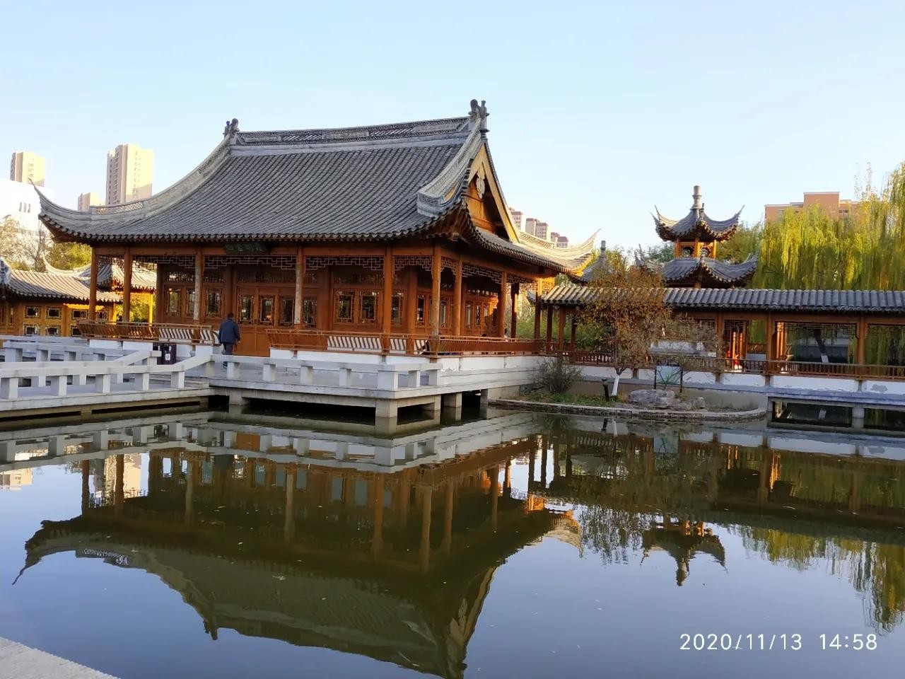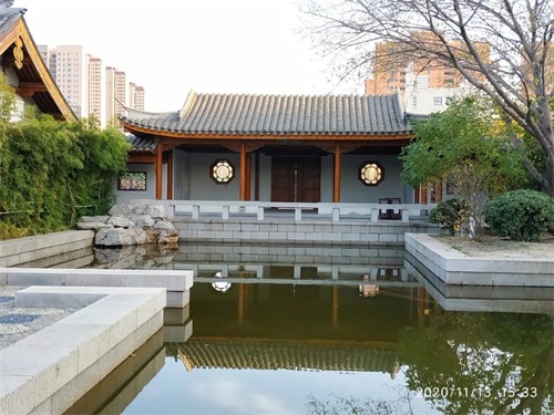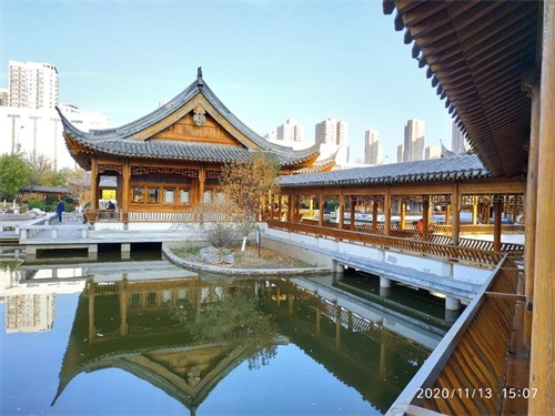 全园布满亭台楼阁,曲径游廊相绕,景色旖旎,静静的池水倒映出亭台楼阁美丽的倩影。