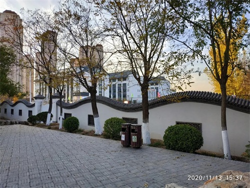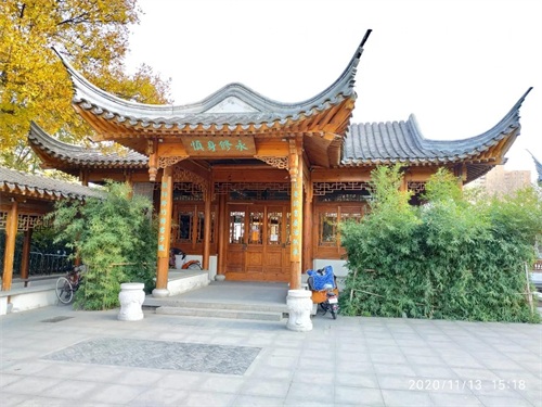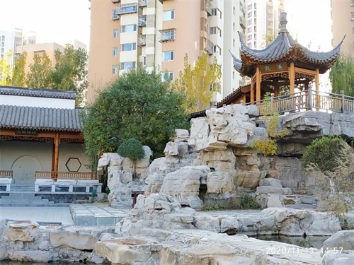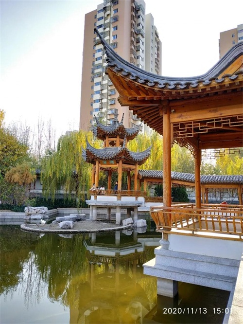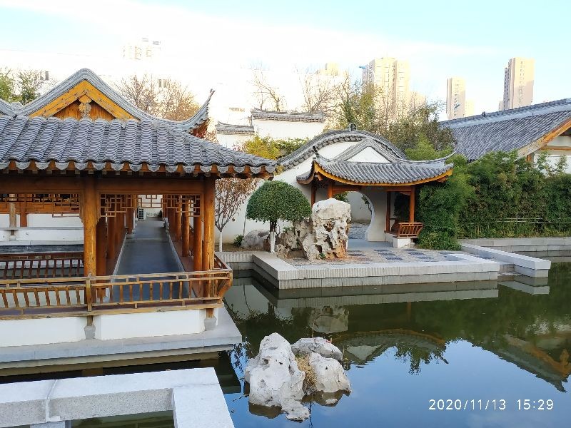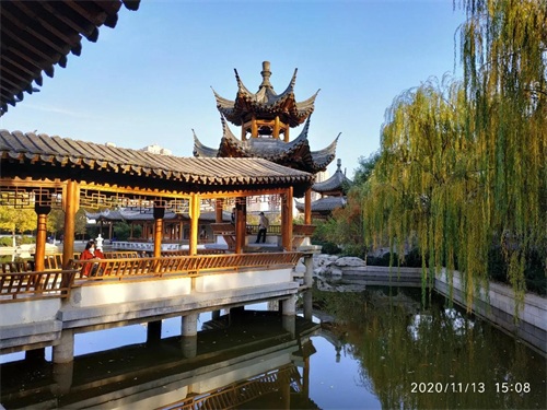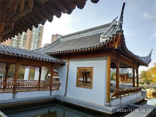 每个亭台顶部都有髙高的翘角,园内的一面墙仿江南古典园林的龙墙,使我不由得想起上海古典园林豫园。