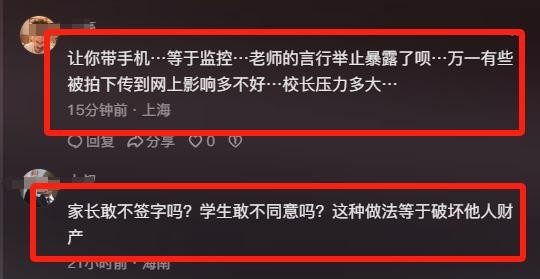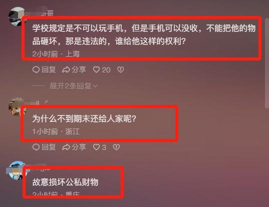事件爆出后,舆论给予了不同层面的诠释和评价。有网友指责学校粗暴无理地侵犯了学生的个人财产拥有权;也有人批评它是在“博取流量”。也有网友认为,严格执行学校规定,打击学生私自携带手机过于“简单粗暴”。父母作为主要受害者,更是感到难以接受。