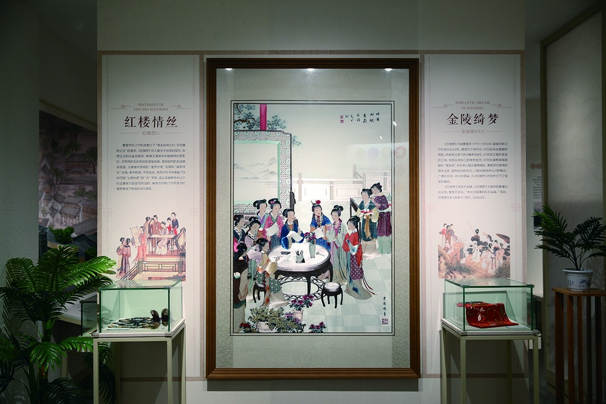 此外,馆内还展出了一幅大型苏绣作品《金陵绮梦》,表现的是《红楼梦》中“海棠诗社”的场景。说到《红楼梦》就不得不提起其作者曹雪芹,当年曹家三代四人曾担任江宁织造府大臣数十年之久,而曹雪芹的童年也是在南京度过的。该幅作品接近满绣,工艺水平极高,每个人物面部表情刻画得精致、生动,惟妙惟肖,令人叹为观止。